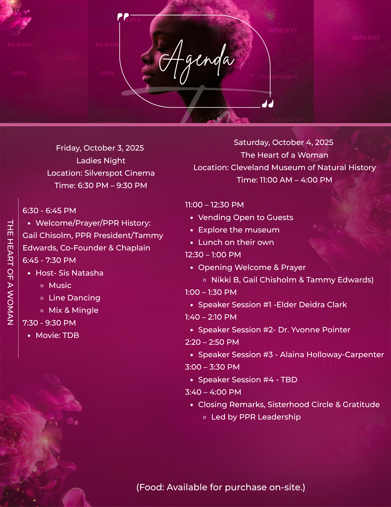 Join us October 3–4, 2025 for The Heart of a Woman — a transformative gathering where we create a safe, uplifting space for women to share their stories, celebrate their resilience, and connect deeply with one another. Together, we’ll explore life’s challenges and triumphs while building bonds and accessing resources that inspire healing, growth, and lasting change.